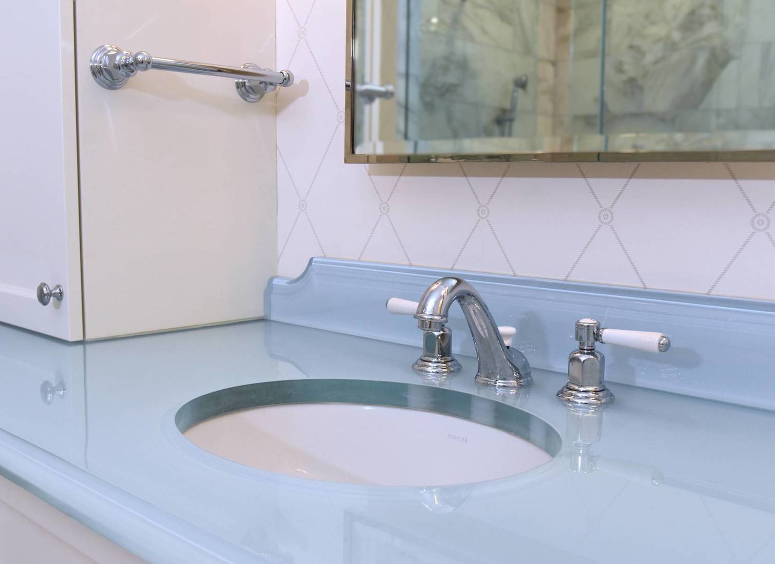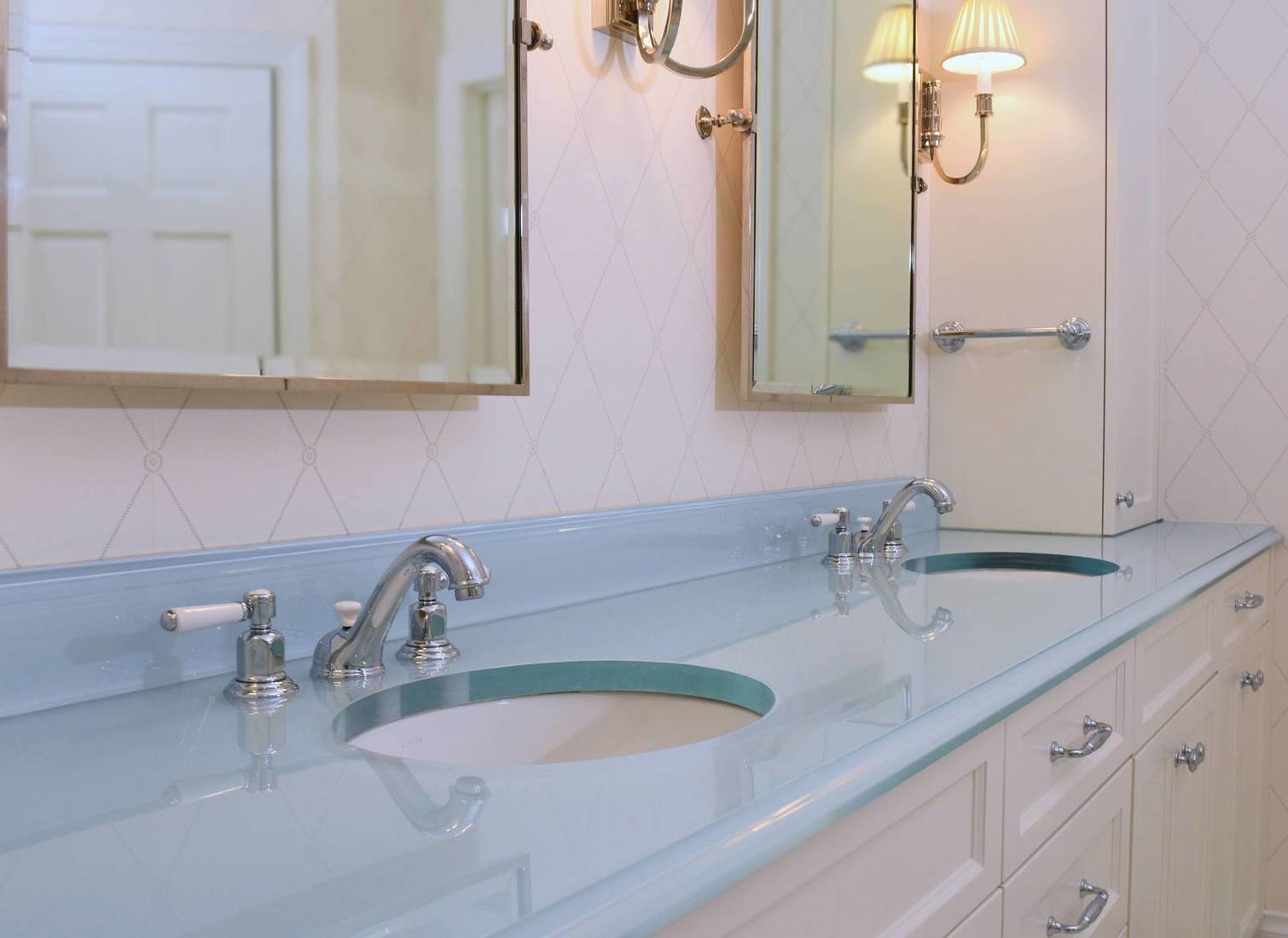 1 1/8 inch Starphire Fuzion Bath Glass Countertop Vanity and backsplash with Wave Texture and mirrored substrate